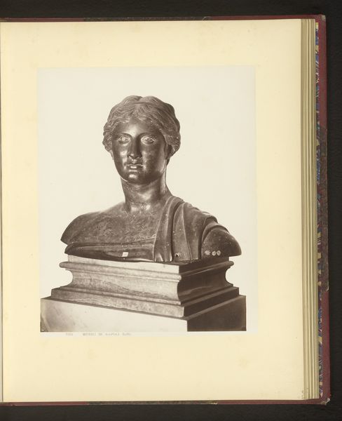 Curator: Here we have Giorgio Sommer's photograph, "Buste van Matidia," taken sometime before 1879. Editor: It has a stark, almost severe elegance. The way the light catches the marble feels dramatic. It’s as if the subject is simultaneously present and intensely removed. Curator: Sommer was a master of capturing sculptural form through photography, wasn't he? Notice how the photograph isolates the bust against a dark background, really emphasizing its shape and texture. The subtle gradations of light suggest a three-dimensional object rendered in a two-dimensional space. Editor: I'm struck by the choice of subject: Matidia, niece of Emperor Trajan. This bust, itself a historical artifact, is further filtered through Sommer's 19th-century lens. I'm interested in how this photograph presents Roman imperial women. Curator: Absolutely. Sommer is meticulously cataloging art in Italy through photography, focusing attention on form. Consider the folds of the drapery, for instance—their delicate arrangement drawing the eye around the entire composition. There's a controlled grace at play here. Editor: And what does it mean to represent her as a symbol of power, but also as a largely unsmiling face. This makes me wonder about representations of women and power in antiquity—who had the power to make these images, to display them? What narratives did they serve? Curator: A potent set of questions. As a study in contrasting tones and textures—smooth marble against a velvet backdrop—Sommer’s work demonstrates the power of photographic realism, highlighting the formal characteristics. Editor: The power dynamics implicit in the Roman Empire continue to resonate in the choices Sommer makes, as this photography is still life and portrait. The dialogue extends into the present moment as well as reflecting on how we regard this photograph today. Curator: Precisely. The way this image merges classical art with emerging photographic technologies creates its enduring impact, a fascinating interplay that still yields rich discoveries through visual investigation. Editor: A reminder that we’re always looking both forward and backward when considering art, its subjects, and its lasting effects.