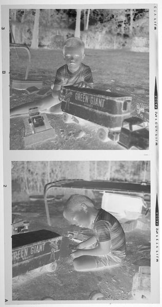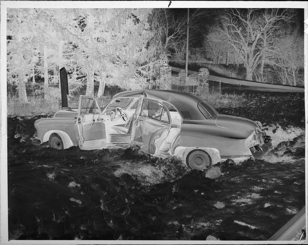 Curator: Here we have an untitled photographic print of a wrecked car, possibly from the mid-20th century, created by Lucian and Mary Brown. Editor: It's eerie, like a ghost caught in a flashbulb. The inversion of light and shadow lends it this spectral quality. Curator: The negative image emphasizes the stark contrast between twisted metal and the surrounding scene, highlighting material breakdown after the car's production. Editor: It's like a mangled machine's soul laid bare, questioning the promises of progress. Does the destruction outweigh the convenience? Curator: The Browns' photo challenges us to consider the real costs tied to our reliance on material goods, from manufacture to obsolescence. Editor: Right, it really makes one ponder our relationship with machines and maybe how we should remember their ultimate mortality, like our own.