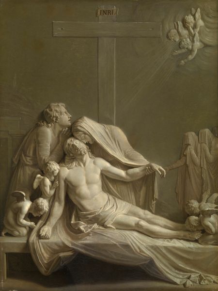 Curator: This is J.F. Clemens' 1786 print, titled "Sokrates." It employs etching and engraving techniques and is currently held at the SMK, the National Gallery of Denmark. Editor: My initial reaction is one of quiet introspection. The sepia tones contribute to a dreamlike state. It's dominated by this brooding figure and ghostly apparition, a somber scene overall. Curator: The depiction of Sokrates, slumped and burdened by thought, speaks to broader conversations of intellectual freedom within autocratic systems. Clemens seems to highlight Socrates as a figurehead for marginalized and defiant scholars, those who challenge the status quo despite the ever-present threat of the powerful ruling elite. Editor: Absolutely, and look at the symbolic layering: The prominent urn to his right alludes to eventual mortality, echoed by the ethereal figures behind him who seem suspended between life and death. Clemens emphasizes an interweaving of philosophical contemplation with an acceptance of destiny. Curator: We need to understand that Clemens was working at a time when revolutionary ideas were challenging European monarchies, he found resonance in Socrates' story. It questions structures of power in much the same way many leaders in continental Europe at the time sought to do. His radical questioning led to his prosecution; it's interesting how these images are charged politically. Editor: And visually, observe how Clemens uses light to separate the temporal world, inhabited by a three-dimensional Sokrates, from what appears to be a spiritually or mentally envisioned space of symbolic, near allegorical figures in the background. Even the basket in the foreground signals to me a domestic reality he is at once bound to but separate from through his intellectual engagement. Curator: That tension is what elevates this beyond a simple portrait to me, showing a personal life at odds with social expectations. By portraying Socrates like this, Clemens subtly critiques similar issues prevalent in his time: political power and individual liberty. Editor: It leaves you contemplating, doesn't it? Whether it be about philosophy, impending execution, or artistic intent. The visual harmony allows the symbolic density to quietly unfold. Curator: It highlights how symbols are timeless. Looking at this etching helps us trace lines through history connecting questions of power and personal expression from antiquity to our day.