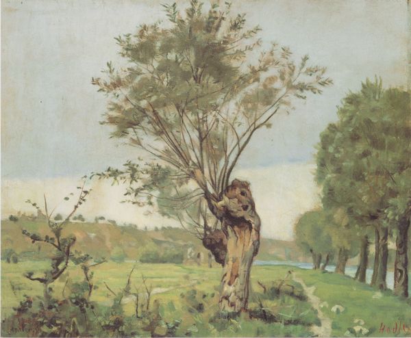 Curator: This is Telemaco Signorini's “Il Quercione alle cascine,” an oil painting created in 1866. Signorini was a prominent member of the Macchiaioli group, and this landscape exemplifies their style. Editor: It’s striking how that large oak tree dominates the scene, doesn't it? Almost obscuring everything behind it with its vast canopy. There’s a hazy, dreamlike quality about it, a stillness that I find quite compelling. Curator: Absolutely. Signorini, in line with the Macchiaioli, was invested in capturing the optical impression of light and color, creating what they termed "macchie," or patches. Editor: Yes, you can see how those broad, textured strokes give a real sense of immediacy to the work. It feels less about precise detail and more about conveying a feeling of being present in that landscape. It's almost like you're capturing a fleeting moment. It really makes me wonder about that lone figure in the background… are they even aware of the presence of the large Quercione? Curator: Considering the social history of the period, that lone figure might represent the agricultural workforce who toiled the land during the unification of Italy. We have to consider this artist, like other Italian intellectuals, participated in discussions around the role of work. It really makes the contrast even stronger, doesn't it? The figure toiling versus the oak basking in a sun-kissed landscape? Editor: That is very perceptive, bringing into play a broader discourse about Italy during this particular historical turning point. Now, understanding that contextual piece you pointed out definitely informs a more nuanced read of it for me! The large oak as a witness of time… The contrast really deepens with what it means to root oneself to something greater. It makes one pause. Curator: Indeed. Signorini wasn't merely depicting a scene; he was engaging with contemporary societal concerns. His Macchiaioli approach offers a view into their unique concerns about history in flux. Editor: What starts as a pleasing, almost Romantic landscape subtly transitions into an engaging visual statement! Thank you for unraveling some of those richer layers!