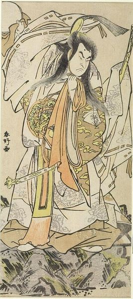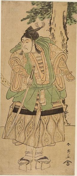 Curator: This is Katsukawa Shunko's portrait of the actor Sakata Hangoro II, held here at the Harvard Art Museums. Editor: My first impression is how much the patterned kimono dominates the composition, almost swallowing the figure. Curator: It's a woodblock print, likely mass-produced for popular consumption. The actor's image becomes a commodity. Editor: Look at the linear quality of the beard contrasted with the flat planes of color. The semiotic weight there is really interesting. Curator: The materiality of the print itself, the paper, the ink, speaks to the era's burgeoning print culture and its effects on fame and representation. Editor: The choice of such vibrant colors really emphasizes the performative nature of the actor, a visual spectacle. Curator: And the labor involved in the carving, printing, and distribution—a whole network supporting this single image. I find that compelling. Editor: Seeing how the artist uses flat planes to convey the actor's facial expression really emphasizes the abstraction that's happening here. Curator: Indeed, it reveals the intersection of artistic skill and mass production shaping celebrity. Editor: It offers a lot to think about; I'm still considering what to make of it.