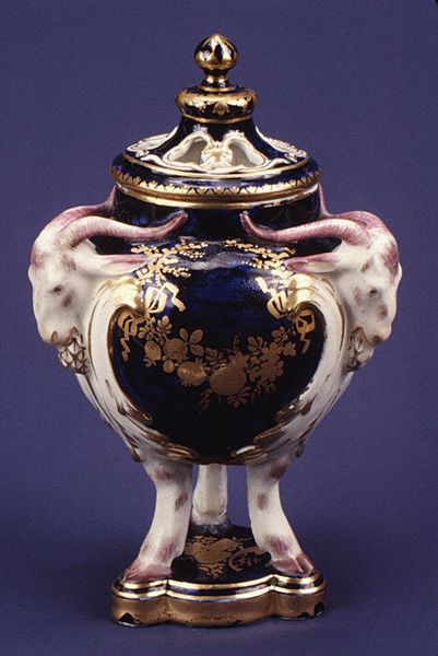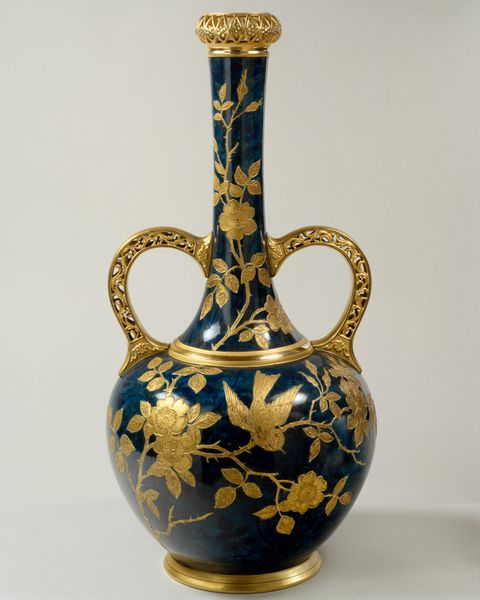 This vase was produced by the Greenwood Pottery Company in Trenton, New Jersey, sometime between 1861 and 1933. It’s made of porcelain, decorated with gold and platinum. The dark blue glaze imitates the fashionable aesthetic popularized by the French firm Sèvres, while the golden floral decoration is a clear reference to Japanese art. The late 19th century was a time of unprecedented fascination with the arts of Japan. International expositions and new museum collections gave the American public a taste for what was then seen as the exotic elegance of Japanese art. Potteries like Greenwood sought to capitalize on this taste. Firms like this one were able to serve a growing middle class with aspirations to high culture, but without the means to buy rare and expensive imports. To better understand this piece, one might research the history of the American ceramics industry and its relationship to international trade, art education, and cultural diplomacy.