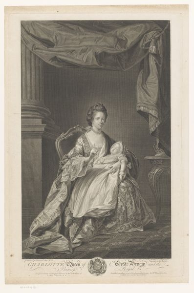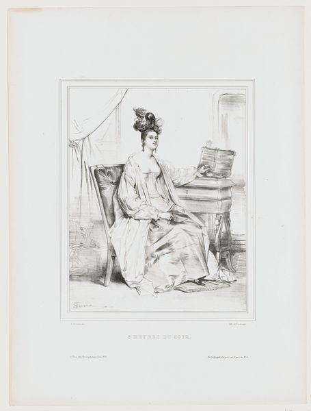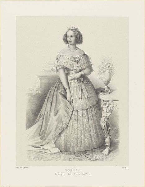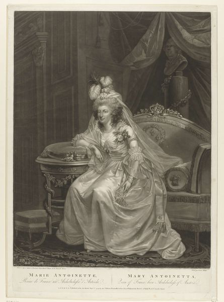 This is Amédée Geille's lithographic portrait of Marie Antoinette, Queen of France. The composition presents a study in contrasts, using light and shadow to articulate both form and social commentary. Geille employs a semiotic language of dress and setting to convey Marie Antoinette’s status. Note the intricate detail of her gown against the backdrop of classical architecture, which symbolizes the opulence and order of the French monarchy. The softness of the lithographic lines, however, introduces a sense of fragility, hinting at the instability beneath the surface of royal life. The textures are meticulously rendered, yet the overall tonality suggests a world on the verge of dissolution. The portrait plays with signifiers of power and vulnerability. The Queen is framed by symbols of her authority, yet she is also presented as a subject of scrutiny. This duality invites us to question the relationship between representation and reality, and the ways in which images can both reflect and shape our understanding of historical figures.