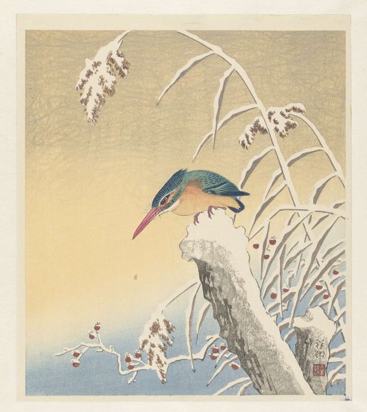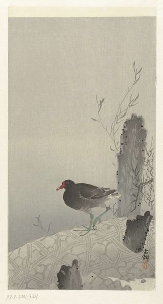 Ohara Koson made this woodblock print of a heron on a snowy branch, but when, exactly, remains a mystery. The soft grays and browns give a sense of stillness, like time is frozen. I love how the snow isn’t just white, but layered with subtle grays, suggesting depth and shadow. Look closely, and you can almost feel the cold, crisp air. What strikes me is the incredibly thin lines of the bird's legs, so delicate. The branches, burdened with snow, droop down as if exhausted, yet the bird stands firm, a symbol of resilience in winter's embrace. This piece reminds me a bit of Hiroshige, especially in the way he captures a mood with such simple means. Ultimately, art like this is all about feeling more than understanding, so let your own imagination take flight.