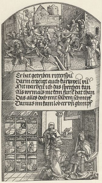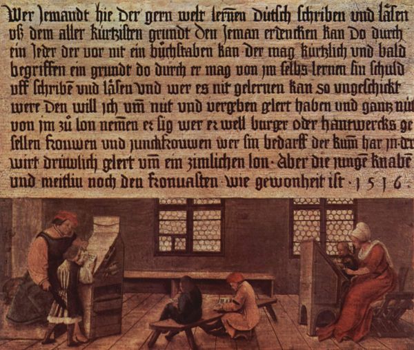 Curator: This woodcut, Lucas van Leyden's "The Birth of Christ," created between 1512 and 1516, is striking in its stark materiality. The roughness of the medium, the carved lines so clear and unyielding… It speaks to the physical labor involved. What catches your eye about it? Editor: Well, I'm really drawn to the way it’s split in half: text on one side, the image on the other. I wonder about that choice. Curator: Exactly. What relationship do you think that establishes between the word and the image? We often consider the artist's skill and vision, but what about the printer's labour, or even the paper maker’s? Consider that the text itself would’ve been carved into the wood. What does that say about the value assigned to these different processes, particularly the reproductive process of printmaking, at the time? Editor: So you are thinking that the physical making of the artwork changes our perception? It is a commercial object as well as an object of reverence? Curator: Precisely. Woodcuts like this one were more accessible than paintings. They democratized religious imagery to a certain degree, bringing these narratives to a wider audience. The imperfections in the carving, the very nature of the print, becomes part of its meaning. Think about the context: The rise of the printing press, the increasing literacy, what's being made accessible, and who is now participating? Editor: So, we’re moving beyond just admiring the religious iconography and thinking about the materials themselves, about labor, and consumption! It makes me think differently about who had access to art back then. Curator: Yes, by understanding the material conditions of its production, the labor, and the technology, we gain a much richer understanding of the artwork itself and its role in society. Editor: I learned a lot! Looking at it this way gives such a concrete view of art creation and its relation to the social backdrop of the Renaissance.