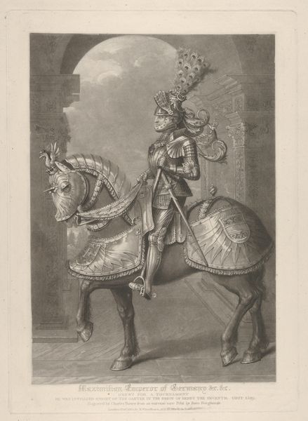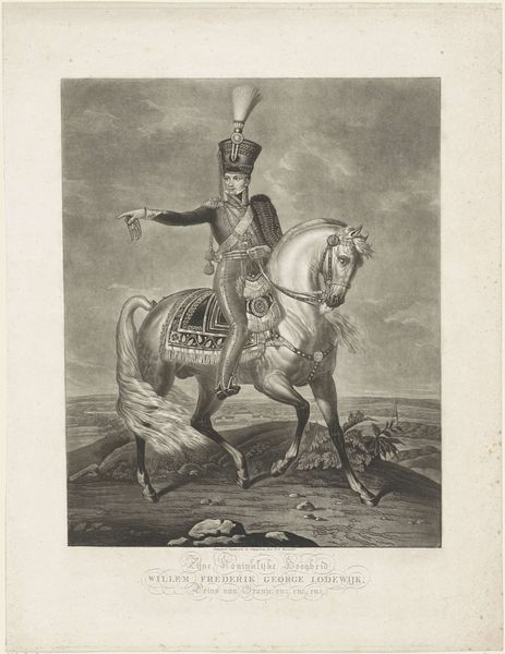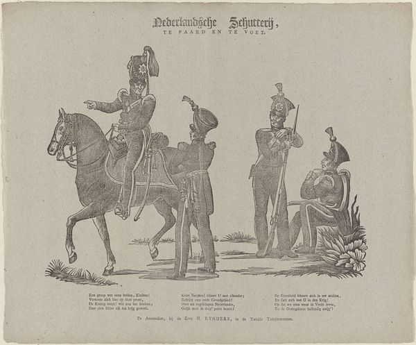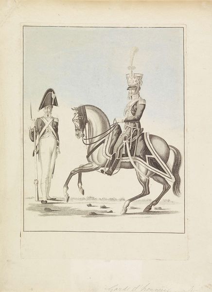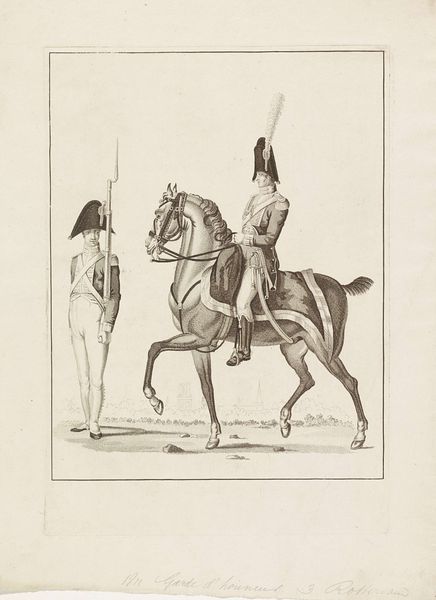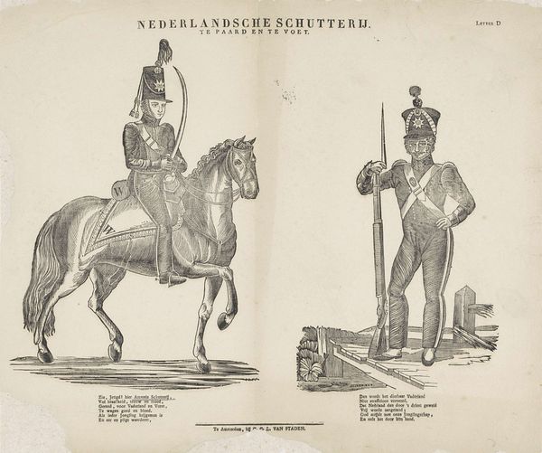 Editor: This is "Schutterij / te paard en te voet" by Jacob Coldewijn, made sometime between 1827 and 1894. It's currently housed at the Rijksmuseum. The artwork is some sort of print, an engraving perhaps, of two guards, one on horseback and another on foot. I'm struck by the precision of the lines and the detail captured in what looks like a mass-produced image. What strikes you most about this piece? Curator: I am drawn to the process behind its creation. This engraving, likely intended for wide distribution, reveals a tension between artistic skill and the demands of a growing print market. Notice how the meticulous details, especially in the uniforms, would necessitate a division of labour: skilled engravers working alongside, and possibly directed by, publishers and distributors focused on volume. Consider the societal implications. Who had access to this imagery? What sort of message was this imagery supposed to deliver? Editor: I hadn't thought about it that way. It does seem very detailed for something meant to be widely distributed. Do you think this was supposed to be an affordable print? Curator: Likely, yes. Its value, however, lies not just in its affordability, but in its function. Cheap prints democratized imagery and ideas. By reproducing and circulating images of the militia, it perhaps aided in constructing and propagating ideas about civic duty and military readiness across social strata. How would this have shaped the viewer's perception of the military and the state? Editor: I guess seeing this kind of image frequently, even inexpensively, would have normalised the presence and authority of the military. So, the material context—its accessibility and means of production—shaped its meaning? Curator: Precisely. The production process and the print’s accessibility informed its role in shaping public consciousness. Considering art as a material product within a broader socio-economic framework really enriches our understanding.