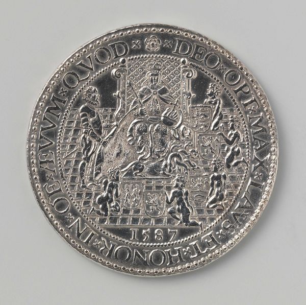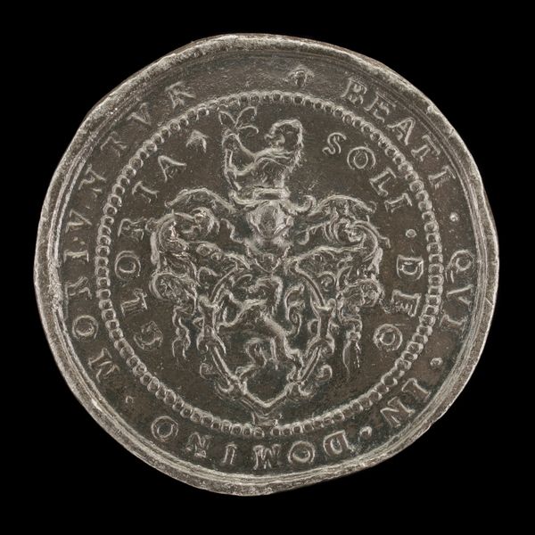 Editor: This is "Siege of Turnhout," a metal relief created between 1592 and 1602 by G.V. Bijlaer. It's currently housed in the Metropolitan Museum of Art. It has a very dense composition! What can you tell me about the historical significance of this piece? Curator: It's fascinating to consider this medal as a piece of public art, really, meant for circulation and display, not unlike a propaganda poster today. This commemorates the Spanish defeat at Turnhout. What do you notice about the Latin inscription? Editor: I see “Victoria Turnotana, Janv. 1597,” celebrating the victory. Then there’s "In oculis nostris…factum est" going around the rim, "before our very eyes…” kind of highlighting the eyewitness nature. What's the full inscription? Curator: Yes! The full inscription around the circumference states, "In oculis nostris admirabile A.Dno factum est", which translates to "In our eyes, it is miraculous, [something] made by the Lord". Think about that in relation to the political and religious climate of the time; the idea that victory is divinely ordained! What does that imply about the depiction of battle itself? Editor: Well, it downplays the human cost, focusing instead on the providential aspect. It makes you wonder about the intended audience and how they perceived such a claim. Was this widely circulated? Curator: Certainly among those aligned with the victorious side. Remember, the politics of imagery is potent, especially in times of conflict. Circulating pieces like this was vital to maintaining political and social order, shaping public opinion through seemingly objective visual "reporting". The question of accessibility, though, depends on who the patron wanted to reach. Editor: So, more than just art, it’s a political tool, shaping narratives about a specific historical moment and meant to reinforce power dynamics? It really gives a new lens on this. Curator: Exactly. It reveals how art, even on a small scale like this medal, actively participates in constructing and disseminating history. Thanks for helping me notice the little details, this was revealing.