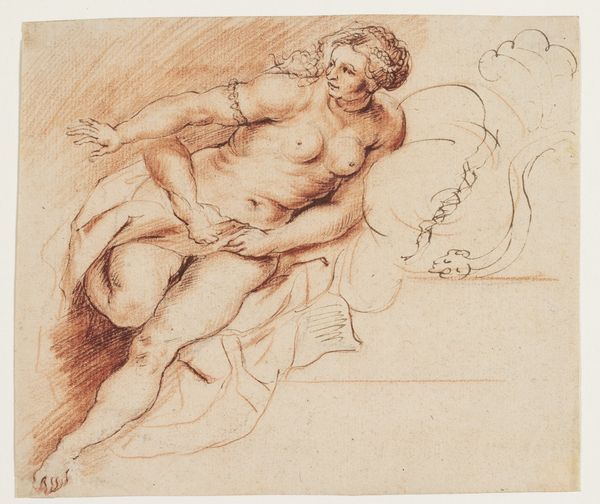 Editor: This charcoal drawing, "Prostrated male nude turned left leaning on his right arm and lifting his left arm and right leg up", was created anonymously sometime between 1600 and 1624. There's something so vulnerable, almost theatrical about the pose. What do you see in this piece? Curator: Well, the drawing immediately situates itself within the academic tradition. We see an idealized male form, but the vulnerability you mention is key. This isn’t just about aesthetic beauty; it’s about power dynamics and representation. Who is this figure for? Who gets to look, and what does that gaze imply about gender, class, and social hierarchies of the time? Editor: I see what you mean. It's a study of the male form, but its positioning could be interpreted in multiple ways, maybe even as an early commentary on societal expectations. Curator: Exactly. The prostration might be submission, but the lifted arm and leg also suggest a fight, a struggle for agency. Consider the power structures of the 17th century, especially within artistic academies. Whose bodies were considered worthy of representation, and whose stories were told? How does this nude figure engage or challenge those narratives? Does it celebrate idealized masculinity, or does it perhaps question it? Editor: That is a different approach than what I expected to find. Thanks! This makes me look at it in an entirely new light. I guess it all comes down to who is behind the gaze and who has the power. Curator: Precisely! By asking those questions, we start to unpack the layers of meaning embedded in what seems like a straightforward study of the nude form. Art invites questioning and re-examination; let us persist in that act.