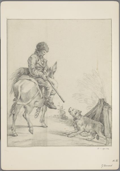 Editor: Here we have "Two Men with a Horse," created between 1767 and 1780 by Bernhard Schreuder. It’s an ink drawing on paper. The image gives off a peaceful vibe; the two men seem relaxed with the horse in a wooded area. What catches your eye when you look at this work? Curator: It whispers tales, doesn’t it? A gentle vignette of everyday life. For me, it’s the sheer humanity of the scene. Notice how the figures interact – that slight tilt of the head, the almost imperceptible touch. It's pure observation rendered in elegant strokes of ink, but consider for a moment; who are these figures, and what are they doing? Do we truly understand what this artwork means today? Editor: Good point. The title just says 'two men,' so, we are missing much of their stories. Curator: Exactly! We bring ourselves to it. Look at that dormant dog and horse in the landscape; for me, they hint at Romanticism, that embrace of nature, emotion, and individual experience that was percolating in Europe. Editor: That's fascinating. So, it's more than just a snapshot, it's a glimpse into a shifting cultural mindset. I appreciate seeing those ordinary moments rendered with such feeling. Curator: Indeed. It’s a simple scene, yet profoundly moving once we accept our interpretation is valid as well as everyone else’s! What a fun exploration into history!