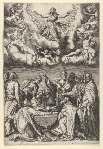 Pietro Testa created this allegorical print to honor Cardinal Franciotti's arrival as Bishop of Lucca. Testa, working in Baroque-era Rome, was deeply influenced by classical antiquity, and here, he resurrects its visual language. The print presents a complex scene filled with mythological and allegorical figures, all gathered to celebrate the Cardinal. We see classical figures alongside putti, emblems of virtue, and symbols of Lucca, all orchestrated to convey a sense of divine approval and civic pride. But it's worth considering how power is constructed in such images. Who is included in this vision of authority, and who is left out? How does the artist negotiate the expectations of his patron with his own artistic vision? Testa’s own life was marked by ambition and struggle. He sought recognition in a rigid art world. Knowing this adds another layer to the print, which presents an idealized vision of harmony and order, a world that contrasts with the artist’s lived experience.