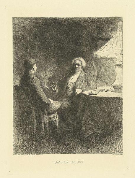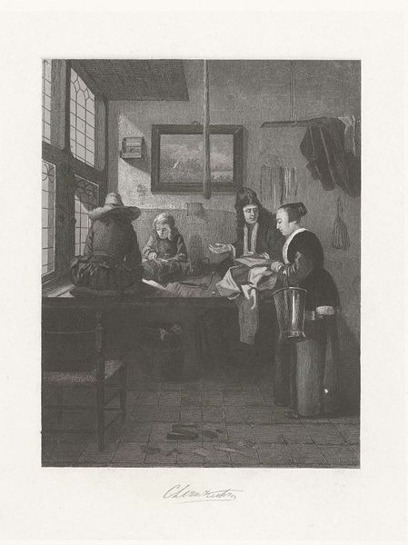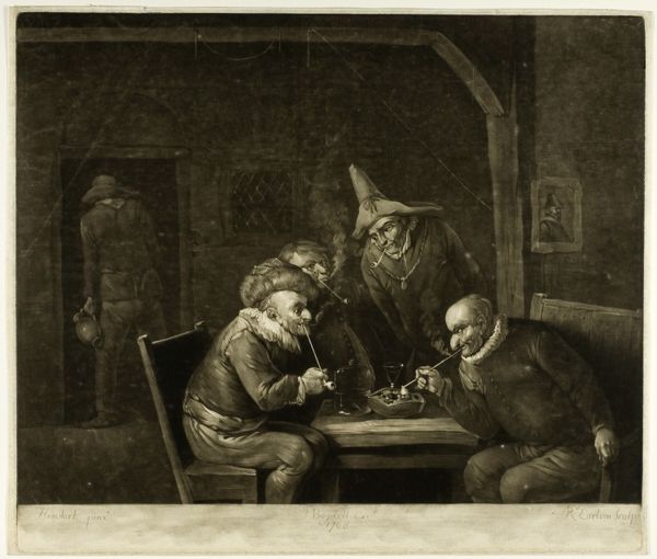 This print, made around 1800 by an anonymous artist, offers a glimpse into a specific time and place: the coffee room of Felix Meritis in Amsterdam. The printmaking process itself, likely an etching or engraving, involved meticulous work, transferring an image onto a metal plate, and then using acid to bite away the exposed lines. The texture of the print, with its fine lines and subtle gradations of tone, gives a sense of the smoky atmosphere. The material reality of the print—its paper, ink, and the labor involved in its creation—speaks to a growing culture of leisure and intellectual exchange. The coffee room was a space for social interaction, and this print provides insight into the traditions of craftsmanship and the burgeoning commercial culture of the time. The very act of creating and distributing such prints democratized images and ideas, making them more accessible to a wider audience beyond the elite circles of art patronage. It is a reminder that the production of images is deeply intertwined with the social and economic forces of its time.