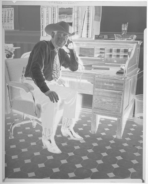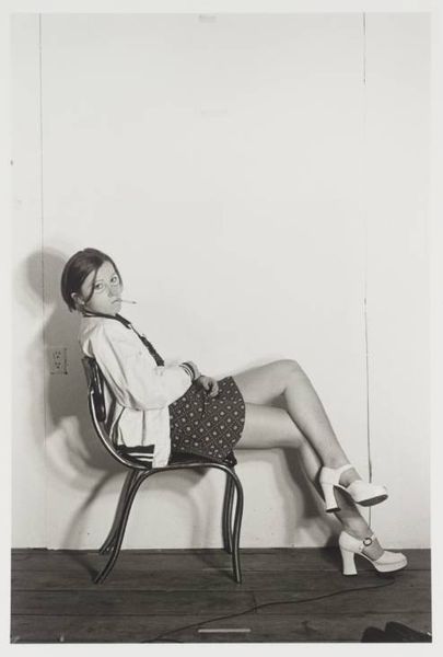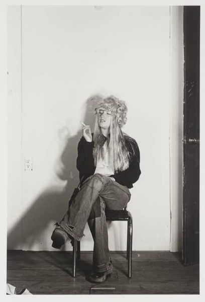 Curator: Here, we see an early black and white photograph by Cindy Sherman, "Untitled", dating from 1976. It’s a gelatin-silver print, showcasing Sherman's burgeoning interest in performance and constructed identity. Editor: My first thought? The mood feels so wonderfully awkward. It's that teenage boredom mixed with this almost studied indifference. Love the slightly too-big blazer! Curator: It’s interesting you say that. Because, in her early work, Sherman really grapples with those in-between spaces, particularly of female identity as constructed through media representation. She uses her own body, in this case, to probe at these complex visual narratives, inviting conversations around gender, performance, and authenticity. Editor: Authenticity, yes! It's almost as if she is waiting for a shoot to start... or finish. And there is the whole monochrome scheme with its slightly depressive, but always poetic take. It’s not the youthful vigor; she seems already tired in many ways, as a reflection of society. Curator: Exactly. Considering the context of 1970s postmodernism, the piece stands as a powerful challenge to traditional notions of selfhood and authorship. Through repetition and disguise, Sherman dismantles the idea of a stable, coherent identity, presenting it instead as fluid and performative. Feminist theory comes into play, highlighting how women are often positioned as objects of the male gaze. Editor: She really makes you wonder who she's trying to be—or maybe, more importantly, who she's being told to be. Curator: Absolutely. By consciously embodying these tropes, she exposes their constructedness, urging us to question the images that surround us. It's not just about what we see but how we see, through the lens of cultural conditioning. Editor: Looking at her, it is also so evident, at least to me, that art isn't just about the polished final product. There is a magic in works that whisper about beginnings and explorations... I wish I was so brave at that age. Curator: I agree, there's something so potent about seeing an artist find their voice, isn't there? In this "Untitled" piece, we witness Sherman’s groundbreaking exploration, setting the stage for a lifetime interrogation of identity, representation and power. Editor: A powerful glimpse indeed... Makes me think about all the possibilities still hidden in a black and white world.