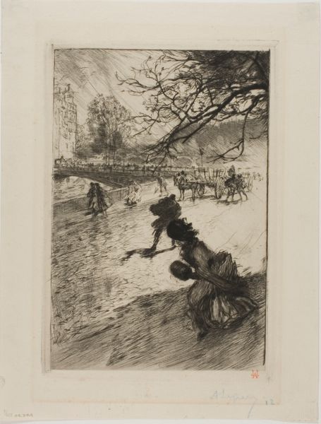 Editor: Here we have Willem Steelink’s etching and pen drawing, "Skater and Saleswoman on the Ice," created sometime between 1866 and 1886. The scene feels quiet and serene, despite all the little details. What stands out to you in this piece? Curator: Ah, yes, a wintry reverie! I’m immediately drawn into the artist’s masterful use of line to convey texture – the rough, frozen surface of the ice against the delicate branches of the bare tree. Doesn’t it remind you of how memories themselves can be both sharp and blurred around the edges? But, really, what do *you* feel when you see the solitary skater? Does he glide towards freedom, or does he skate *away* from something? Editor: I think I see him gliding *away*, almost escaping. It feels a little melancholic, that isolation. I’m also curious about the building on the left – it’s so dark, like a little haven against the cold. Curator: Exactly! A refuge, or perhaps even a reminder of everyday commerce persisting, even as winter grips the landscape? See how that flag gently sways? It suggests a certain…impermanence. And that dark interior – doesn’t it hint at untold stories, of whispered deals and warm drinks amidst the chill? It's like Steelink captured not just a scene, but a whole atmosphere, wouldn’t you say? Editor: Definitely. It makes you wonder what everyone is thinking, like you’ve stumbled into a secret moment. Curator: Precisely! It's less about *what* is happening and more about *how* it feels to be there. Now, doesn’t that idea just give you the shivers in the best way possible? It is a bit like catching a snowflake on your tongue, or is that just me being fanciful? Editor: No, I totally get it! It's fleeting but so evocative. Thanks, I see this artwork with new eyes.