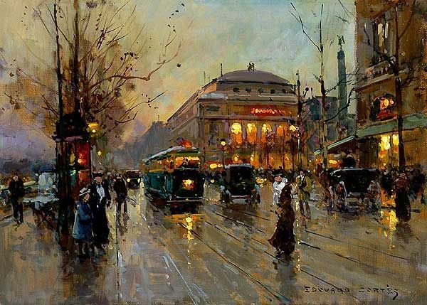 Editor: So, this is Édouard Cortès's *Place de la Bastille*, painted with oils in an impressionist style. There's this wonderful, almost melancholic, feeling that it gives. Like looking at a memory of a cold Parisian evening. How would you interpret this painting? Curator: Ah, yes. Cortès. He had such a knack for capturing the soul of Paris! What I find particularly charming here is how he uses light. The warm glow spilling from the shop windows… it feels like a secret shared on a chilly night. Does it not remind you of a comforting ember against the deep blue night, offering a glimpse into a hidden world within each storefront? Editor: It really does! Like tiny stages set for different stories. Curator: Exactly! It is a dance between light and shadow. Cortès is less interested in literal depiction. More concerned with the poetry of the moment. See how the brushstrokes almost dissolve into the scene itself? It's less about precision, more about feeling. It reminds me of when I stand under a streetlight, and everything is not clear; instead, a moment frozen within my senses. Do you follow my meaning? Editor: I think so! The vagueness adds to the memory-like feeling. The eye fills in the gaps. What do you make of the column of Bastille here? Curator: Consider how the artist uses the city's symbols, not just as landmarks, but to whisper tales of history and change! Like ancient totems holding secret city lives and moments! Editor: I never would have considered that! Thanks, it changes the mood quite a bit. Curator: My pleasure! Art is not only what we look at, but also what stares back at us.