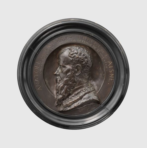 Curator: Here we have an 18th-century ceramic medallion crafted by Josiah Wedgwood. Editor: Striking! It’s almost monochromatic; the subtle relief against the dark ground gives it an austere feel. It appears stoic. Curator: Precisely. Wedgwood was masterful at elevating ceramic production, often blurring the lines between craft and fine art. He employed sophisticated manufacturing processes and specialized labor to achieve this. This relief showcases his celebrated Jasperware—unglazed stoneware dyed with metallic oxides to achieve that characteristic color. Editor: Knowing that shifts my perspective. The Neoclassical style points to a fascination with antiquity, and Wedgwood directly profited from British imperialism. His factory mass-produced cameos featuring enslaved people, for instance, promoting an abolitionist agenda while exploiting labor for raw materials. Curator: Good point. Wedgwood indeed revolutionized production; this medallion embodies a pivotal moment in industrial history, where materials and the labor that shaped them became essential aspects of artistic creation and its consumption. Editor: This medallion, though seemingly a simple portrait, is complex when considering its intersectional narrative. We should consider the economic forces behind artistic endeavors in this period. Who was PtoLALA and what message did Wedgwood aim to convey? Who commissioned this? Curator: Agreed. It's essential to consider the conditions of production and reception, something Wedgwood shrewdly managed himself. Editor: It’s a testament to how even seemingly simple art objects reflect greater social structures and material processes. We should keep questioning the origin, medium, and social meaning of decorative arts, rather than casually placing this on display. Curator: Looking closely at it reveals much about the material culture and economic imperatives of its time. Editor: It forces a broader awareness of both production and exploitation. The past should never be regarded passively.