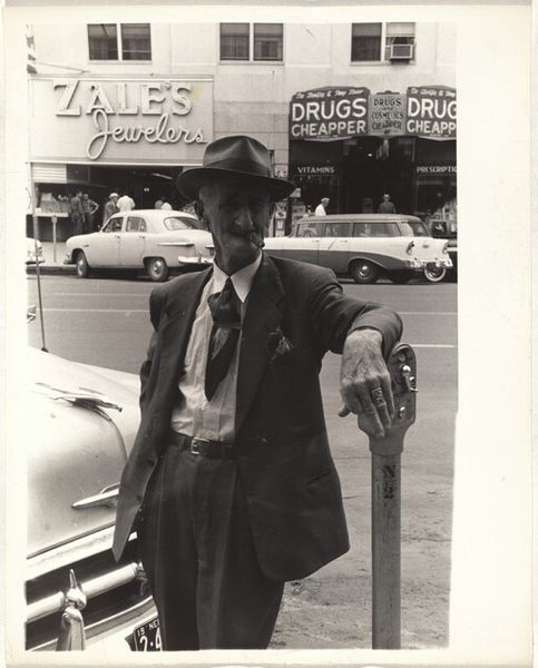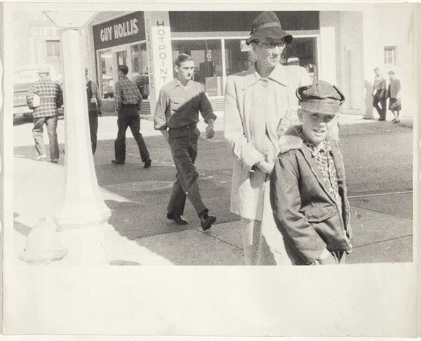 Editor: Robert Frank’s gelatin silver print, “Men and child on street corner—San Francisco,” created in 1956, has a quiet, almost solemn feel to it. The figures seem disconnected despite their proximity. What do you see in this piece, focusing on its formal qualities? Curator: The photograph presents a study in contrasts. Observe the interplay of light and shadow; it sculpts the figures, imbuing them with a sculptural presence. The composition, seemingly spontaneous, is in fact meticulously structured. Do you notice the framing, how the edges crop the figures, creating a sense of immediacy, as though we’ve stumbled upon this scene? Editor: Yes, the cropping is interesting. It does feel like a snapshot, but a very deliberate one. What about the subjects themselves? The differing textures and tones of their clothes draw my eyes, almost like cubist fragments. Curator: Precisely. Note how the artist balances geometric forms, like the briefcase, with organic shapes of the human body, within an urban, orthogonal setting. How do the textures in the different surfaces—fabric, skin, the pavement—affect the viewer's eye? Do these tonal differences bring forth symbolic contrast, in your view? Editor: They add a depth, certainly, and a realism. There’s something about the grittiness of the image that feels very authentic, yet the men appear self-conscious or cautious, maybe distrustful. It seems very modern. Curator: And what compositional or tonal relations can you make out between their clothes? For instance, comparing the texture of their suits versus that of the child’s simple attire, what impressions come to mind, how does the image engage the modern discourse? Editor: I see now, the contrast between formal and casual, maybe wealth versus… not. It all emphasizes a certain alienation or disaffection in the photograph’s modernist aesthetic, but using the formal elements to speak, instead of directly narrating it. Curator: Indeed, the formal devices operate within an expressive potentiality. I leave it to you to contemplate these relations.