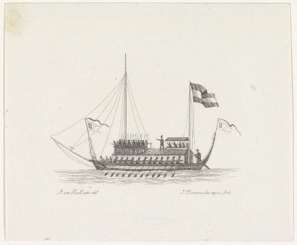 Editor: This is "The Chinese Junk 'Keying'," a lithograph from 1847 by Nathaniel Currier, depicting the ship in New York Harbor. The title itself is quite a mouthful! I’m struck by the detail and the juxtaposition of the Chinese junk with what appears to be an American flag flying proudly. It feels almost like a collision of cultures, what are your initial thoughts? Curator: Indeed! It's as if Currier captured a moment of impossible encounter. To me, this isn’t simply a picture of a boat, it’s a portal. Imagine the gasp of 1847 New Yorkers seeing this vessel – a floating, breathing chunk of Canton arriving after 212 days at sea. Notice how the sharpness of detail slowly dissolves towards the horizon. This gives us a sharp view but also offers us the mystery that these visitors embodied. It makes me wonder how their visit reshaped views on China for a brief moment in time. Don't you think? Editor: That’s such a rich image, like a real-life fairytale unfolding! The way you describe it makes me think of Orientalism. It's beautiful, but was the reality perhaps… more complicated? Curator: Precisely. Currier was trying to capture the wonder, a romantic vision of this "exotic" vessel but undoubtedly it was rooted in existing power dynamics, of Western gaze romanticising distant cultures. But art does that: it holds these contradictions, prompting us to unravel the stories within. Editor: So, it's both a historical document and a reflection of Western perception, tangled up in one print? I hadn't thought of it that way before! Curator: Exactly. Isn't it delightful how one image can hold so much? Editor: Absolutely. It definitely gave me something to consider.
