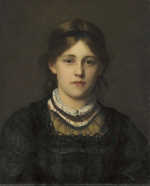 This is a portrait of a girl in traditional Bernese costume, painted by Albrecht Anker. The muted palette and soft brushstrokes create a quiet, almost contemplative mood. Anker's focus is on the formal arrangement of shapes and tones. The girl's profile is rendered with a delicate precision. Her simple, elegant hairstyle and traditional clothing speak to the values of the community. The dark shawl contrasts with the light blouse, drawing the eye to the sitter's face, which is softly illuminated against the neutral background. By using a semiotic system of signs, Anker transforms the girl into a representation of cultural identity and regional pride. Her calm gaze and the carefully detailed costume act as signifiers of tradition and heritage. Through the interplay of light, color, and form, Anker not only captures the likeness of a young woman, but also constructs a powerful symbol of cultural values and historical memory. This portrait invites us to consider how visual elements contribute to broader cultural narratives.