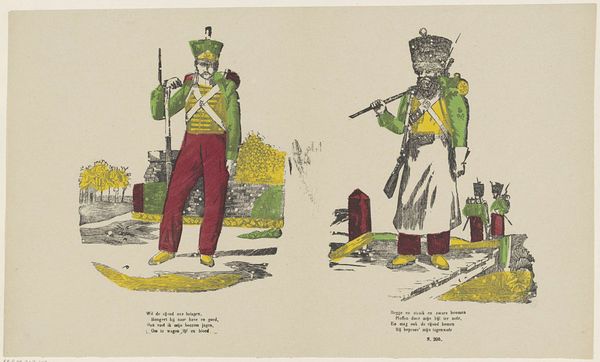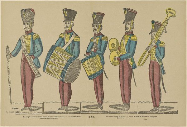Editor: So, this is "Trommelslagers van de koninklijke garde" or "Tambours de la garde royale" by Philippus Jacobus Brepols. It's an engraving dating from somewhere between 1800 and 1833. What strikes me is the almost cartoonish representation of these royal guard drummers – so rigid and colorful. How do you see this piece? Curator: I see this print as a fascinating window into the evolving public image of military power during the post-revolutionary era. Notice the distinct Neoclassical style; it presents a vision of order and authority meant to impress. Consider where prints like this would circulate - affordable and accessible, shaping public perceptions of the military. What kind of power do you think imagery had then? Editor: I guess it was one of the primary ways to showcase military might beyond just witnessing the army in real life. But what about the odd color choices? Why not represent them more realistically? Curator: Exactly! That choice reveals how symbolism overrides realism here. These idealized depictions were about crafting a narrative of strength and discipline for public consumption. The specific colors may connect to the symbolic associations prevalent within the royal court or popular culture at the time. Editor: So it’s less about documentation and more about propaganda, in a way? Showing an image the monarchy wants the public to believe? Curator: Precisely. This wasn't necessarily intended as a straightforward portrait, but rather a carefully constructed representation, designed to project power and influence public opinion in a specific political moment. Editor: It’s wild to think about the layers beneath something that appears so simple at first glance! Curator: Indeed. Studying such artworks through a historical lens unveils the powerful socio-political dynamics at play in shaping the narrative around authority and the military.