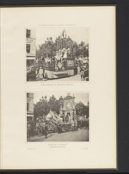 Curator: We're looking at "Processie door een straat in Fribourg, vermoedelijk ter herdenking van de sterfdag van Petrus Canisius in 1597," a photographic print from 1897 attributed to P. Savigny. Editor: Immediately, I’m struck by how somber it feels. Despite what seems to be a celebratory procession, the tones are quite muted, almost ghostly. Curator: Savigny's command of composition is quite apparent. Note how the converging lines of the buildings and street draw the eye directly toward the procession. The contrast between the shadowed foreground and the brighter, receding space is expertly managed. It shows an inherent grasp of tonal value and perspective. Editor: And within that procession, there's a clear hierarchy, isn’t there? The individuals at the forefront are clearly privileged. What kind of politics and social norms dictated who was at the head of that march in late 19th century Fribourg? What systems are they meant to reinforce through visibility and positioning? Curator: That’s a fair observation, and indeed a critical component for pictorialists like Savigny—using the visible world to comment on interior emotional realities or spiritual beliefs, as demonstrated by careful staging and lighting, as is very evident here. Editor: This piece also prompts questions about power. Who has the authority to document this procession, to freeze it in time? Photography, from its inception, has been entangled with the colonial gaze, dictating who gets seen and how. What biases did Savigny bring to his documentation? Curator: Though an adept representation of its historical moment, Savigny is also manipulating the medium itself. There’s a deliberate softness, an intentional lack of sharp detail that almost obfuscates specificity to create a scene rooted in a much broader set of themes. Editor: So while it is ostensibly an event that centers spirituality and commemoration, there is also something much deeper at play when observing a spectacle, such as the politics that were inherent to such rituals. Thank you for offering insights that have deepened my reading of this work. Curator: And thank you for illuminating some often-overlooked aspects, viewing beyond mere structural presentation. I find myself, as usual, admiring anew Savigny’s masterful use of the photographic form, while, simultaneously, being thankful for additional, very necessary contextual considerations.