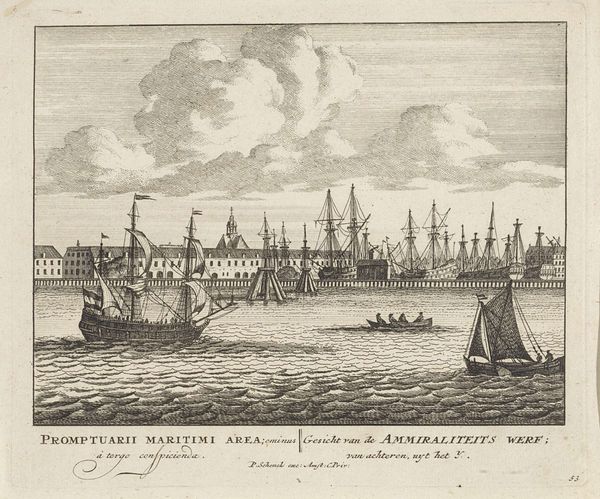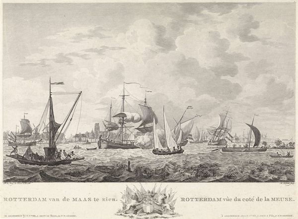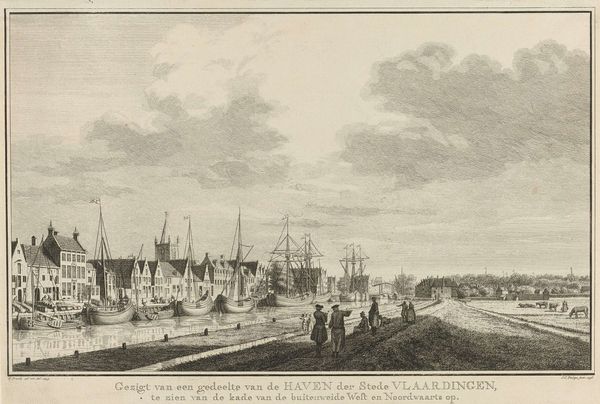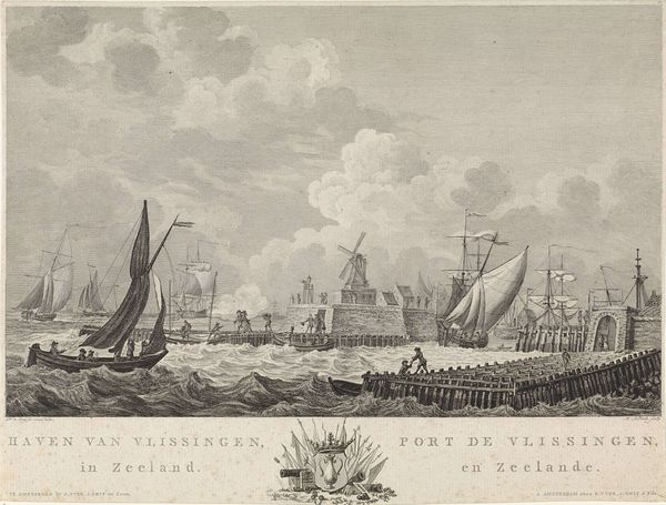 Editor: This print, titled "Gezicht op de haven van Maassluis," or "View of the harbor of Maassluis," by Mathias de Sallieth, dates to between 1781 and 1787. The engraving depicts a bustling harbor scene; it’s quite detailed, almost documentary in its feel. What symbols or deeper meanings might we find hidden in this busy port? Curator: A harbor, first and foremost, represents connection—the ebb and flow of trade, people, and ideas. Look at how de Sallieth renders the boats: notice the specific types of vessels? What do they tell us about Maassluis' role in larger networks? Editor: I see different sizes of boats. Some smaller fishing boats are close to the shore, and larger ships are sailing further out. Does the activity indicate Maassluis as a vital Dutch port? Curator: Precisely. And what about the figures populating the scene? Consider their placement and actions. Are they simply bystanders, or do they represent something more? Observe that there’s an absence of, say, grandeur and displays of wealth: there are simple folk, a focus on labor. The visual culture conveys a sense of social harmony. Does this emphasis challenge or uphold certain ideals? Editor: That’s interesting. It feels less about individual success and more about the collective effort of the community in relation to trade. So even something as seemingly straightforward as a harbor scene can communicate a lot about the culture that created it. Curator: Exactly. And what we remember as a culture. Looking at this print has sparked my imagination about trade routes of the day and what life may have been like for its inhabitants. Editor: I learned to look beyond the surface and think about the symbols and values a work embodies. It’s so fascinating!