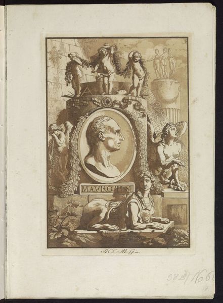 Reinier Vinkeles created this print of medallions portraying Aristides, Cato the Elder, and Flaminius. The arrangement invites us to consider its structure: three oval portraits ascend a grey wall, while two cherubic figures to the right hold the last portrait. The monochrome palette underscores a study in contrasts between the smoothness of the medallions and the textured stone wall. Structurally, the composition plays with the concept of portraiture itself. By placing these figures within medallions, Vinkeles suggests a form of immortalization, reminiscent of ancient Roman practices. The cherubs, symbols of innocence and timelessness, reinforce this notion, suggesting that these historical figures are not just remembered, but perpetually revered. Vinkeles uses the print to engage with semiotics of power, memory and representation. The medallions are not simply portraits, but also signs encoding cultural values and historical narratives. Consider how each element contributes to a broader dialogue about how we construct and maintain collective memory.