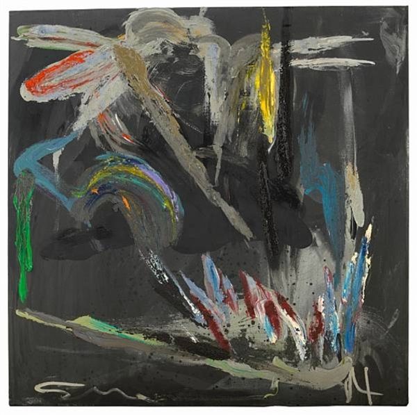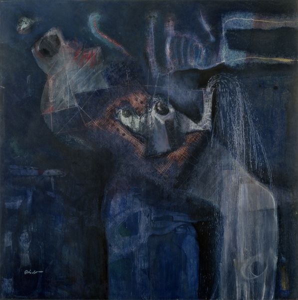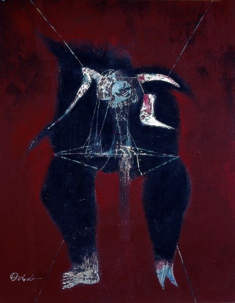 Ramon Oviedo’s painting presents a fragmented figure against a textured, dark blue background. The figure's crude form and raw materiality evoke a sense of primal expression. The composition defies traditional representation; the figure appears disjointed, suspended by thread-like lines that dissect the space. Oviedo uses line and form to challenge our expectations. Notice the interplay between light and shadow and the use of white and yellow that adds a spectral quality to the figure, contrasting with the deep blues and blacks of the backdrop. Oviedo destabilizes the established categories of form by engaging with a semiotic system where the body is deconstructed and reformed, creating a tension between presence and absence. It compels us to confront the fluidity of meaning itself.
