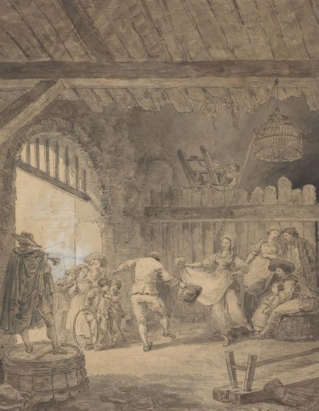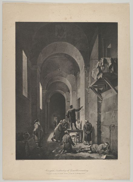 Editor: Here we have Louis-Joseph Isnard Desjardins' "Architectural Subject." It's evocative, almost romantic, with that ruined interior. How would you interpret this work? Curator: It whispers to me of time's passage, doesn't it? The sepia tones wrap us in a nostalgic embrace. The figures, are they explorers, or perhaps ghosts revisiting a forgotten grandeur? It feels like a stage set for memory. Editor: That’s a beautiful way of putting it. I hadn’t thought of them as ghosts, but it does add another layer. Curator: The interplay of light and shadow creates a dramatic space. What tales do these stones hold, do you imagine? Editor: It’s definitely got me thinking about ruins in a new way. Curator: Exactly! Art’s greatest gift is the way it expands our perception.