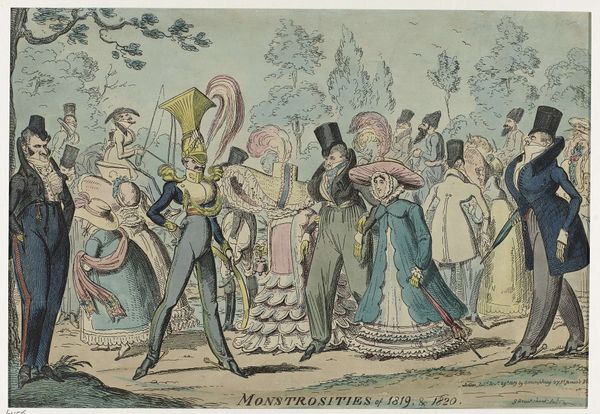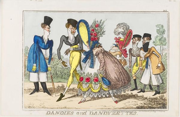 George Cruikshank produced this hand-colored etching titled 'Dandies or Monstrosities of 1818.' Cruikshank's caricature offers a critical view of fashionable society in Regency-era England. The exaggerated styles and affected poses lampoon what he saw as the ridiculous excesses of the upper classes. During this period, England was undergoing rapid social and economic change, and anxieties about class and identity were often expressed through satire like this. The "dandy" became a figure of fun, embodying aristocratic decadence, while the term "monstrosities" underlines the artist's disapproval of the latest trends. Cruikshank's work speaks to the politics of imagery, questioning the values of a society undergoing transformation. To fully understand this print, we can look at periodicals, fashion plates, and social commentaries from the time, found in libraries and archives. The image, therefore, becomes a vital document, reflecting the debates and tensions of its age.