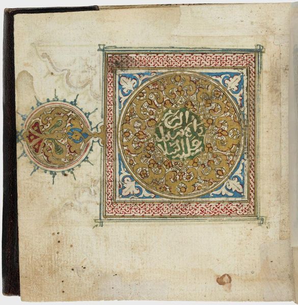 Editor: This is a page from a copy of the Qur'an, likely from the late 14th or early 15th century, made with ink, pen, and drawing on paper. The calligraphy seems so deliberate and contained, framed by these intricate decorative borders. What do you see in this piece? Curator: I see the enduring power of the written word. Calligraphy, in this context, becomes more than just text; it's a visual embodiment of sacred knowledge. Consider the Kufic script, its angularity lending a sense of gravitas. These forms aren't just read, they’re experienced. Editor: Experienced how? Is it the geometric patterns? Curator: Precisely! The geometric elements, combined with organic vine-like decorations, suggest an ordered universe, a divine blueprint reflected in miniature. Think about the meditative process of creating such a page – each stroke, each carefully chosen color, a devotional act. Editor: It does feel like a very intentional composition, but the worn edges make it also seem fragile, hinting at the passage of time and use. Curator: Indeed. These imperfections are, in a way, testaments to its longevity and its importance in the lives of those who have interacted with it. It evokes a powerful sense of cultural memory. What do you make of the color choices? The prevalence of blue, specifically? Editor: It makes me think of royalty, and I guess just vastness, like the sky or the sea. Curator: And those associations are not accidental. The use of blue might symbolize the infinite nature of divine knowledge, mirroring our own cognitive processes in finding universal metaphors. Editor: This really makes me appreciate the complexity of even a single page. Thank you. Curator: It’s a wonderful reminder that objects carry within them layers of meaning, waiting to be uncovered.