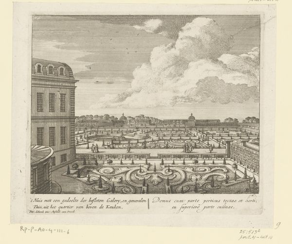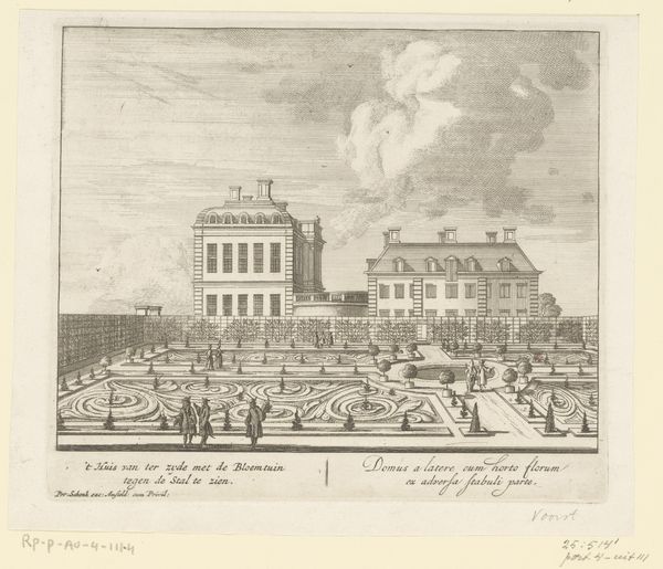This print, titled "Gezicht op Huis De Voorst," is an engraving created by an anonymous artist. It offers a meticulously structured view of a Dutch estate. The composition is dominated by the geometric precision of the architecture and garden layout. Notice how the straight lines of the buildings contrast with the curvilinear patterns of the garden paths, creating a visual rhythm that leads the eye through the scene. The buildings themselves are rendered with a keen attention to proportion and balance, reflecting a classical architectural sensibility. The print’s formal arrangement underscores a broader cultural interest in order and control during this period. The garden is not just a space of natural beauty, but a carefully designed environment that mirrors a desire to impose structure onto the natural world. The lines and forms employed here serve as signs of human mastery over the landscape. Consider how the artist uses line and form to convey not just the appearance of the estate, but also its underlying principles of order and spatial organization. This artwork invites us to decode the cultural values embedded within its visual structure.