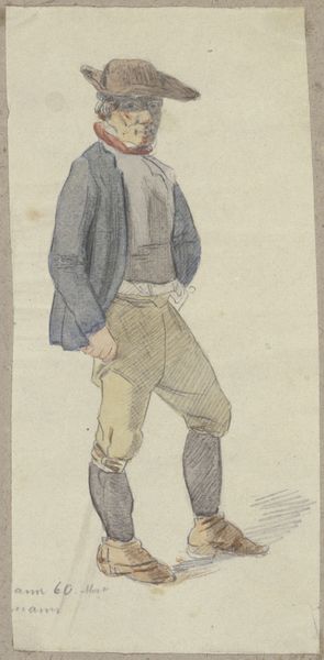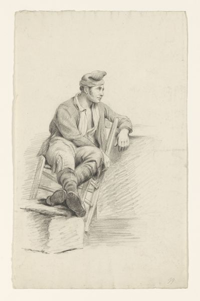 Curator: This drawing, "Dreng, der læner sig mod et bord," which translates to "Boy Leaning Against a Table," is by Hans Smidth and dates to the 1860s. It’s a pencil drawing, currently held at the SMK, the National Gallery of Denmark. Editor: It feels intimate. Like a snapshot, a glimpse into the everyday life of a young boy. The medium itself, pencil on paper, emphasizes the immediacy, doesn't it? Curator: Absolutely. The choice of pencil as the medium tells us something about the artist's process, doesn't it? This wasn't meant as a finished, public-facing masterpiece, but possibly a preparatory study or even just a personal observation rendered quickly and directly. We should remember that pencils, as a relatively cheap and easily portable medium, were transforming artistic practices around this period, and opening up new venues and demographics. Editor: Precisely. Notice how the social status of the subject isn't immediately apparent? His attire suggests a certain level of... practical functionality. Consider also that art academies at the time often required rigorous study of the human form. Was this boy from Smidth’s close environment or did the artist select him in order to train his skills, thereby turning a personal experience into work. Curator: The boy's leaning posture, the somewhat unfinished quality of the lines, contributes to the realism. This drawing captures a transient moment. And it suggests the kind of conditions of art-making within institutions: materials available to students, class divisions between portrait and genre art etc. Editor: His expression is so thoughtful. It captures the social context in a subtle manner. Is it possible the artwork aimed at subtly engaging with contemporary conversations on childhood, education, class mobility? Curator: Possibly. Smidth’s own biography might shed some light there, the institutional background too. Editor: Well, this piece definitely invites us to contemplate on both the individual within a social frame, and the material practice that brought him to life in pencil. Curator: Indeed, a fleeting encounter etched into paper, reminding us of the layers of artistic decision, available material and context at play, in something seemingly simple.