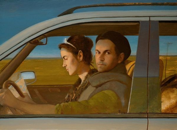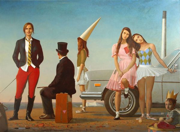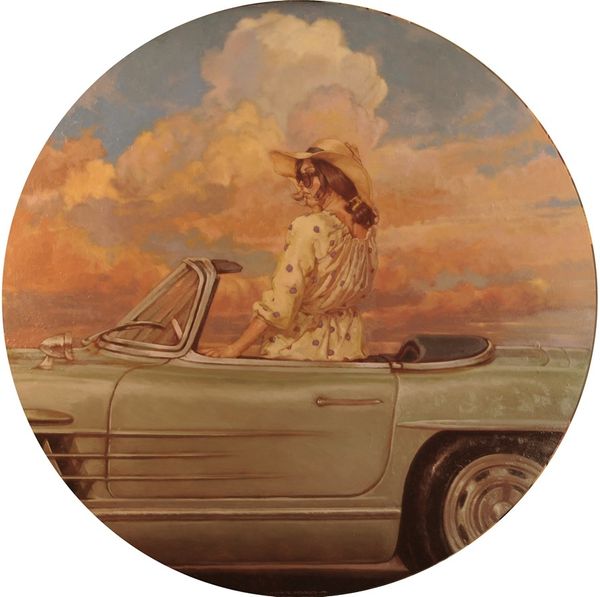 Curator: Today we're looking at Joseph Lorusso’s painting, "Times Like These." Editor: It strikes me as a study in contrasts—the vintage cool of the car against the warm, almost nostalgic light. It's overwhelmingly melancholic. Curator: Absolutely. The figures are women traveling together—though the exact setting is nonspecific, the artwork subtly evokes themes of freedom, mobility, and perhaps, female camaraderie within historically patriarchal structures. Editor: Note the composition: Lorusso uses the strong horizontal of the car’s body to ground the piece. The cool grays and blacks of the vehicle almost overwhelm the brighter colors, trapping the subjects inside an inky cage. See how it forces our eye to their faces? The upward gazes, those sunglasses. They're performing carefree rebellion. Curator: Yes, and if we read deeper into the sunglasses and headscarves, these function as potent cultural symbols. In mid-century America, accessories weren't merely adornments—they became statements of identity. Consider the rise of female independence during the time. How are these characters pushing gender and identity constructs? Editor: You make an excellent point. Visually, those headscarves! The patterned fabric clashes wonderfully against the red interior of the car, drawing our focus. Then, think about how the diffused sky bleeds into the horizon. It lacks precise definition, offering no true escape for our subjects. Curator: That's very observant. Lorusso deliberately obscures a definite sense of place, I feel that adds layers regarding issues such as escaping societal confinement or seeking new frontiers. Editor: Ultimately, the allure lies in this friction, doesn’t it? We see these women pursuing the open road, maybe freedom itself, but are confined in metal—and maybe even their own image. Curator: A compelling insight. "Times Like These" speaks to a collective yearning, a desire to challenge existing narratives that continues to resonate. Editor: I see the brushwork as very expressionistic in parts; so alive with energy that contradicts the still mood that defines much of this artist's overall presentation. The paradox of that truly excites me.