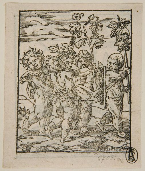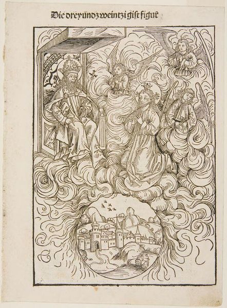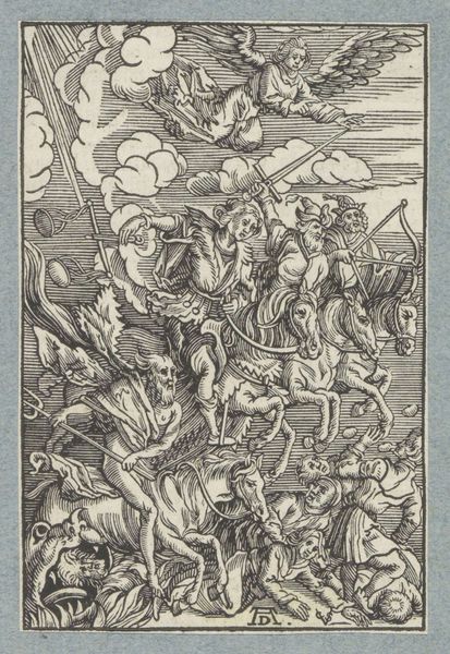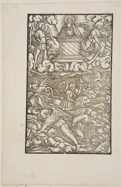 Editor: This woodcut is by Hans Holbein the Younger. It's called "The Four Horsemen of the Apocalypse." It's so stark and... well, terrifying. What do you make of all the symbols presented here? Curator: Holbein uses the visual language of the Apocalypse to tap into deep-seated anxieties about death, judgment, and the end of times. The horsemen themselves are powerful symbols of conquest, war, famine, and death—each carrying specific iconographic markers. Editor: So, the figures are more than just scary illustrations? Curator: Precisely. The figure carrying scales, for instance, evokes ideas of judgment. And Death, of course, brings mortality to the foreground. These images were intended to resonate with collective fears and beliefs. What do you make of the angel overhead? Editor: It feels like a counterpoint; perhaps a glimmer of hope amidst all the doom. I guess the image reminds us of humanity’s fears, but also our capacity for hope.