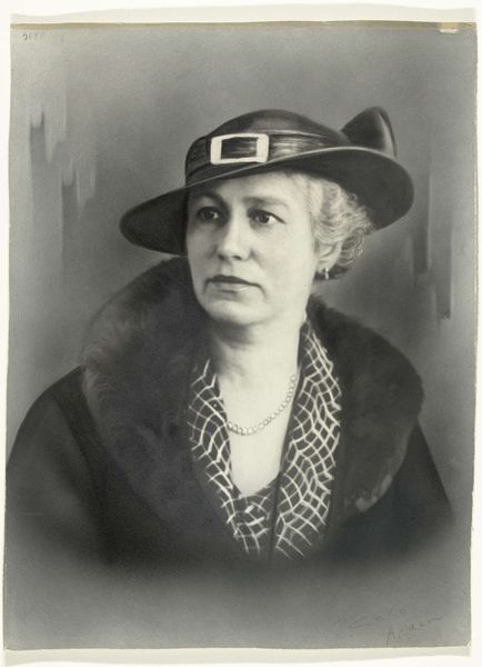 Editor: Here we have an untitled portrait, most likely from the mid-20th century, by Martin Schweig. The photograph shows a woman with glasses and a hat, and it feels very classic, almost like a vintage postcard. What strikes you most when you look at it? Curator: It whispers of untold stories, doesn’t it? I see a woman of substance, someone who has lived a full life. The corsage and hat suggest a special occasion, but her gaze holds a hint of melancholy. Do you notice the inscription near her neck? Looks like the artist’s edit suggestions. Editor: Oh, I missed that! "Cut some," it says. So it’s a working proof! I guess even portraits can be works in progress. Thanks for helping me see beyond just the image. Curator: Absolutely. It's about imagining the artist's hand, the subject's thoughts, the silent dialogue across time, really.