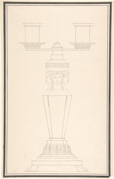 Gustav Rügemer created this drawing of an Indian column and architrave. The drawing emphasizes line and form, focusing on the column's structure and decorative elements. The detailed rendering of the column creates a sense of depth and three-dimensionality despite the monochromatic palette. The column is divided into distinct sections, each with unique surface treatments. The base shows a progression from simple horizontal lines to more ornate, stylized wave patterns, capped with panels of figural reliefs. Above this, the shaft transitions into a bulbous capital adorned with vertical striations, echoing traditional Indian architectural forms. The architrave at the top features panels with scenes of riders and figures, which introduce a narrative element, contrasting with the more abstract designs below. Rügemer's meticulous drawing elevates the architectural study to a level of art. The structure invites viewers to contemplate the relationship between form and decoration, representation and abstraction, and the cultural dialogue between Europe and India during the 19th century.