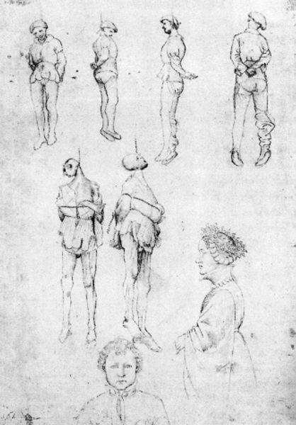 Curator: Welcome. Today, we’re exploring Leonardo da Vinci’s "Anatomical studies (larynx and leg)," a drawing rendered circa 1510, using ink on paper. Editor: It has a strikingly immediate feeling. The detailed leg juxtaposed with the sketch-like quality of the larynx study really captures the process of understanding the body as a working object. Curator: Precisely. This sheet exemplifies Leonardo's relentless pursuit of knowledge, blending art and science in a way that challenges the power structures of the time, particularly concerning access to knowledge and the human body. We often forget dissection was heavily policed. Editor: It's important to acknowledge that the ink he’s using would have been handmade, maybe from oak galls, that gathering, preparing, and application being labour-intensive. This focus shifts our consideration, from divine creation towards material construction. Curator: I find it revealing how Leonardo’s anatomical studies challenge prevailing conceptions of the body, pushing against traditional representations that often marginalized women's bodies and perspectives on health. He questioned those visual regimes. Editor: Look closer: it’s fascinating to consider how the texture and density of the ink vary. See how da Vinci exploits that, achieving shading and depth. We understand process and the transformation of materials through use of particular tools. It speaks of consumption through close observation. Curator: Indeed. And while we look at that line quality, let's consider how the detailed leg becomes more than an objective representation, but an idealised masculine form, which raises questions about whose bodies are worthy of anatomical investigation and artistic portrayal. Editor: Seeing that detail, one gets an appreciation of what was available, the instruments that gave this precision – whether crafted metal, specific acids, the support of other makerly bodies… we also can consider the trade relationships that allow these tools. Curator: To me, it underlines the role of anatomical drawing in challenging visual hierarchies and paving the way for medical education for future generations. It's about social mobility and resistance through images. Editor: For me, that’s less present; but my eye still finds an incredibly considered example of skillful practice and process. Thanks for pointing out the power dynamic, a new awareness for me to consider alongside the artistic. Curator: And for me, examining materiality always informs context!