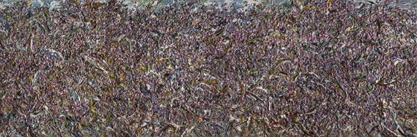 Editor: This is Gustav Klimt’s "Horticultural Landscape with Hilltop," painted in 1916. It's an oil painting, and the texture looks quite thick. It feels overwhelmingly floral; the entire surface seems to vibrate with blooms. What do you see as you analyze its visual composition? Curator: The painting’s power arises, precisely, from its surface. Observe how Klimt uses a dense network of brushstrokes. These strokes aren't descriptive; they function as independent marks of color and texture, woven together to construct the pictorial field. There's a flattening of perspective; the background and foreground merge due to the consistent application of paint. The painting privileges the act of seeing and painting over representational accuracy. Notice the recurring pattern of small dabs, almost pointillist in their application, yet they abandon any scientific rationale to evoke pure optical sensation. Do you see that lack of atmospheric perspective? Editor: Yes, it's quite striking. Everything appears to be on the same plane, denying any real depth. It's as if he's less concerned with creating an illusion of space and more interested in the sheer materiality of the paint. The "flatness" actually adds to the decorative quality of the piece. What did this approach accomplish, compared to the traditional landscape painting? Curator: Klimt shifts our understanding from regarding a painting as a window onto a scene, to an object. Klimt thus makes a claim about the painting’s identity as an artifice and its relationship to the decorative tradition. We may understand landscape no longer as mimetic, but as surface and construction. It presents an engagement with the materials, the brushstroke. A formalism and a pictorial device for abstract sensation in paint! Editor: This definitely gives me a new perspective! It is not only the landscape depicted but how Klimt is depicting it, almost celebrating painting itself. Curator: Indeed. The very process of painting takes center stage in Klimt's canvas!