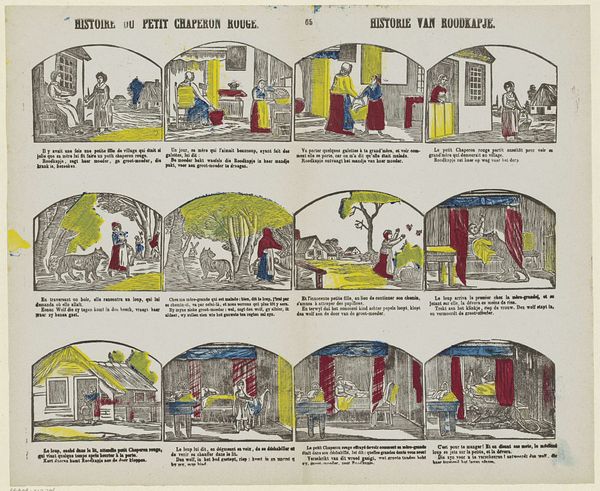 Curator: Welcome. Before us hangs a rather fascinating print, dating from roughly 1850 to 1870. Its full title, in Dutch, is “Leer uit Klein Duimpjes wedervaren. / Dat men door list wel slagen kan; (...)" which roughly translates to "Learn from Little Thumb's Adventures. / That one can succeed through cunning (...)." The artist credited is P.C.L. van Staden Czn., and the medium is etching. Editor: Well, that's a mouthful. My first impression is… story time! It reminds me of those old-fashioned comic strips, all arranged in neat little boxes. A bit faded and quaint, like a forgotten children’s book found in an attic. Curator: That's a keen observation. Indeed, this piece utilizes narrative art principles, similar to genre paintings of the Dutch Golden Age. It's essentially a visual comic, telling a story panel by panel, much like Little Thumb, or Tom Thumb as some know him. Editor: I love how each panel is its own little stage. There's a naïve charm to the drawings that completely disarms me. It's telling a dark fairy tale. Curator: Absolutely, the social context is intriguing. These kinds of prints were often made to circulate moral lessons, imparting wisdom to children and the broader public through easily accessible imagery, playing on the familiarity and popularity of folktales. Editor: It’s incredible to think about how many hands this little sheet may have passed through. Did the viewers think that this comic was frightening? Educational? Amusing? Maybe all three at once! I feel like that question of a children's perception still hangs over the work today, nearly 200 years later. Curator: A question for the ages, I suppose. What's your takeaway? Editor: That even small, fragile things can hold immense stories and reflections of our history. Plus, that trickery and a good scheme are often the seeds of revolution. How about you? Curator: I'm struck by the enduring power of art to shape perceptions and morals. And also to remind us that sometimes, cunning trumps strength. Thank you.