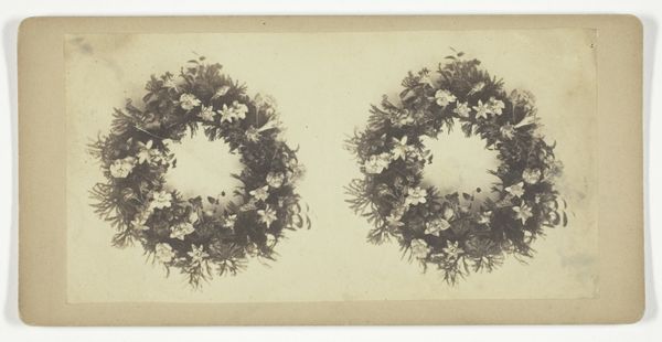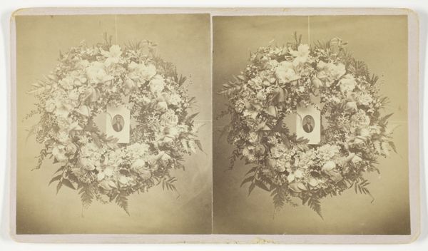 Curator: Here we have an albumen print, an "Untitled" piece by C.H. Freeman from 1874. It's a stereograph of a flower wreath; these images were often viewed using a special viewer, making the scene appear three-dimensional. What's your initial impression? Editor: Somber beauty, definitely. The monochrome palette mutes the exuberance we usually associate with flowers. It feels… memorial, almost like a memento mori turned into something graceful. Curator: Precisely! Wreaths have long been associated with cycles, memory, and eternity, and the presence of a commemorative inscription suggests that this specific floral arrangement holds an emotional significance for its recipient. Editor: Looking at the specific blossoms—roses, it seems, and some smaller wildflowers—I wonder about the symbolic weight given to each species. Was there a deliberate language being communicated through this choice of blooms, like the Victorian practice of floriography? Curator: Absolutely. Back then, each bloom could carry messages. I’d have to look closer, but even the arrangement, the way the flowers are interwoven, contributes. Notice how they form a halo or gateway. Editor: The sepia tones add a layer, too, a hazy distance. Albumen prints often give this warm depth; there is so much tone there to create depth from highlights through browns. You see the texture, even in a reproduction. Curator: Think about photography itself, still relatively new then. Choosing photography over painting to preserve the memory feels so poignant; the choice lends gravity and directness to that emotional impulse. Editor: It does—but I feel it transforms the mourning, from a deeply individual act into a curated display, preserved and multiplied through photographic means. Does the act of documenting sorrow dilute its impact or amplify it? Curator: I'd wager on amplify. There’s a ritual aspect to preserving ephemera this way, an almost compulsive urge to keep those we lose alive. The technology captures the sentiment, the shared language of mourning in bloom. It is the material capturing memory, transformed in the archive. Editor: It's striking how an "Untitled" image manages to say so much! I see a blend of fragility and persistence here. It leaves you contemplating impermanence in its most elegant dress. Curator: Indeed, it causes one to pause. There is something incredibly grounding about observing images with strong connections to our history. It helps connect me to past ways of viewing.