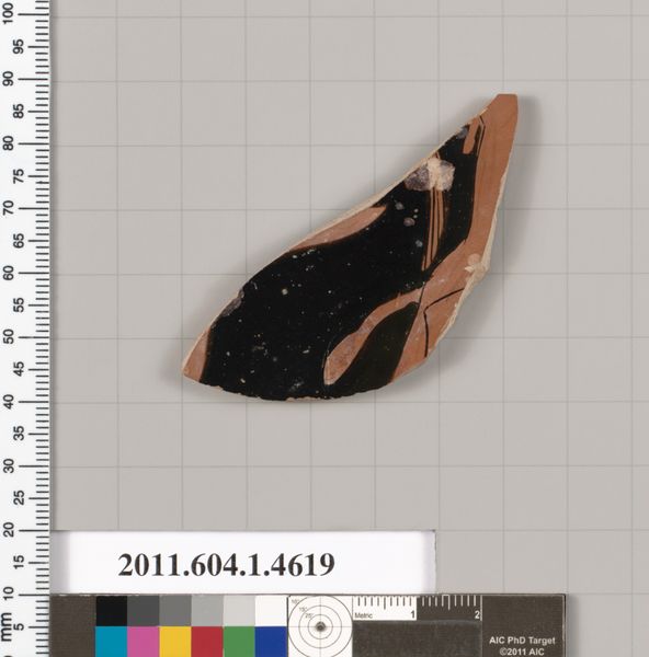 This fragment of a terracotta kylix was made by an anonymous artist. Even in this small piece, we can see the care and skill that went into its creation. The smooth, reddish-brown terracotta was formed on a potter's wheel, a technology that enabled the mass production of vessels in ancient Greece. But this wasn't simply a utilitarian object. The fragment features black glaze decoration, carefully applied with a brush to depict a figural scene. The high degree of specialization required to produce pottery like this meant that it was a valuable commodity, traded widely across the Mediterranean. Consider the labor involved in extracting and processing the clay, shaping the vessel, firing it in a kiln, and finally decorating it. Each step required specialized knowledge and skill. This fragment reminds us that even the most humble objects can tell us about the complex social and economic systems that produced them. By paying attention to the materials and making of this kylix, we can begin to understand the world of ancient Greece in a new way.