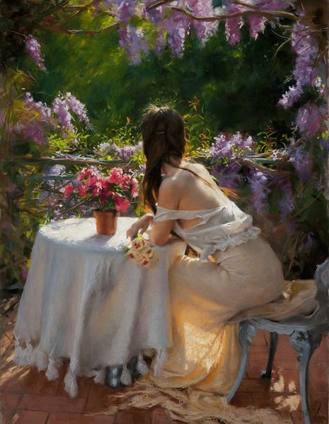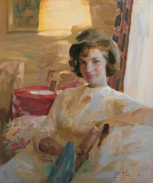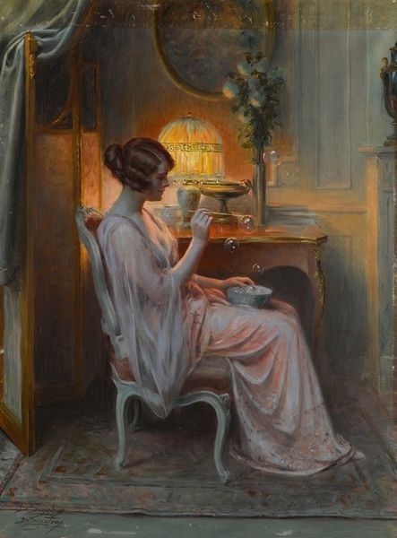 John Michael Carter painted "Amanda" with oils on canvas sometime after 1950. It's a scene of domestic tranquility, but if we look closely, we can see that it's also loaded with cultural meaning. This artwork is likely from the United States, and the scene alludes to upper-middle-class life. The dress code and the tea set are markers of class and gender. It suggests a world of ladies' luncheons and parlor visits. The woman's melancholic expression and pose are a commentary on the restrictive role of women in society, which were topical issues in Carter's time. To understand this painting more fully, it would be useful to research not only the biography of the artist, but also the history of American social mores and gender roles in the late 20th century. This is the work of the art historian: to see how art both reflects and comments on the world in which it was made.