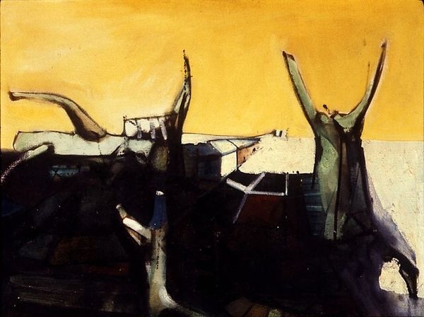 Curator: Welcome. Here we have Istvan Farkas’s oil painting, "Seaside Landscape", completed in 1935. Editor: My first impression? Eerie. Like a dreamscape just before a storm. Those looming trees framing this lone winding path…it almost feels forbidding. Curator: The materials, particularly the impasto application of the oil paint, definitely amplify that mood. The heavy textures create this really weighty sense, grounding the scene in a tactile reality despite the somewhat surreal atmosphere. One could imagine the texture mimicking the experience of that coastal landscape. Editor: I completely agree. There’s this almost aggressive brushstroke to the composition; look how that heavy impasto lends itself to the buildings in the distance, really amplifying their presence on the horizon. It adds so much character to the location. It also evokes, for me at least, this slightly isolated feeling. A singular house. A lone path. It sparks an emotional response beyond just scenic appreciation. What could someone be experiencing in this place? Curator: Looking at it from a material perspective, this expressiveness wasn't achieved easily. Oil paints in the '30s demanded skilled handling. The texture implies both careful planning and intuitive response – and certainly access to quality pigment, as those blues seem unwavering. And how interesting, those colours – how did they inform Istvan's decision? Did his suppliers play a role in this? Editor: Oh, you know I'm captivated by colour! This vibrant but muted sky – like an almost electric indigo. It does a weirdly good job setting an odd atmosphere! It feels so isolating to me and kind of…romantic in an end-of-days way? But then, that bright white path winding toward the buildings in the distance offers this beckoning light of some kind. Curator: These dichotomies point towards potential turmoil in the social and cultural context during the artwork’s era. But maybe also Farkas' personal journey. His engagement with the means of production would certainly influence that journey. Editor: I see that, actually. The texture lends itself perfectly to highlighting and exaggerating both, amplifying their relationship within the image as a whole. It is truly impactful and evocative! Curator: Definitely gives us some new perspectives to take with us. Editor: Couldn’t have put it better myself. Time to go grab a seaside landscape of my own!