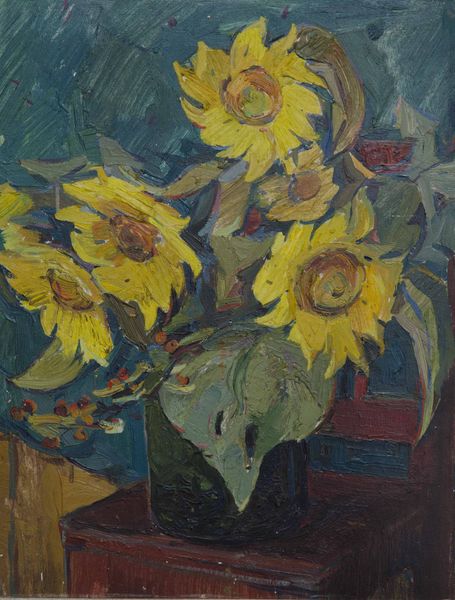 Editor: This vibrant still life by Martiros Sarian, painted in 1954 with oil paints, bursts with color. The yellow and white flowers create such a joyful and energetic mood. What stories do these particular flowers tell, and how might we interpret their arrangement? Curator: The arrangement sings to me of cycles, both personal and universal. Yellow, often linked to sunlight and life force, speaks to memory and remembrance in many cultures. Here, see how Sarian uses this color to draw our eyes towards images we connect to joy. Note that some of those bright blooms are subtly starting to wilt. What could that transition from vibrant color to a muted tone signify? Editor: Maybe a reminder of the transient nature of beauty and life, a bittersweet feeling. The composition, while vibrant, feels a bit melancholic. Curator: Exactly. And those vases... notice their varied shapes, their colors and levels of translucency, offering contrasting symbols of what might endure over time. In that light, how does your reading of the painting shift? Do they represent different kinds of preservation? Editor: I didn't notice that at first. That idea adds so much depth! It's as if the painting is speaking not just about beauty, but also about how we hold onto memories and what shapes they take over time. Curator: Indeed. It encourages us to explore what we choose to preserve within ourselves. This approach can connect us to each object through time and history. Editor: I hadn't considered how a seemingly simple still life could carry such complex emotional and symbolic weight. I'll never look at a flower arrangement the same way again. Curator: That's the gift of art, isn’t it? Revealing the silent language that shapes our understanding.