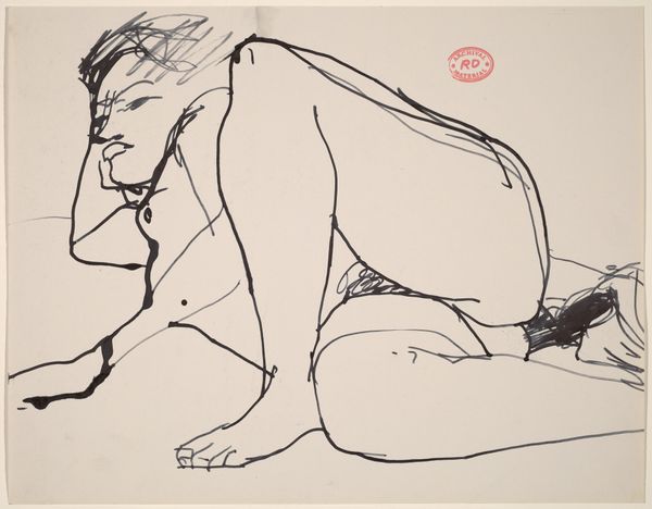 Editor: We're looking at a striking ink drawing titled "Harjoitelmapiirustus Kultakauteen," or "Study Drawing for the Golden Age" by Magnus Enckell. Curator: The urgency in those lines! It conveys such rawness and immediacy, wouldn’t you agree? The hatching, the almost frantic energy in the strokes defining the figure... it speaks volumes. Editor: Absolutely. You feel the hand of the artist, and the swiftness of execution. Look at how the ink pools in areas of shadow, especially under the figure – it's almost as if the body anchors itself through gravity and the materials give weight to this action. How would you interpret Enckell’s treatment of the human form here? Curator: There's a departure from academic ideals. The form is simplified, almost abstract in places. Yet the essence of the figure, that hunched posture and the positioning of its face towards us, remains deeply human. It challenges our ideas of what constitutes the body’s portrayal as noble or even just correct through an artistic interpretation. It is almost a study in itself, an artistic process. Editor: The medium also allows Enckell to confront notions around value - it's 'just' ink and paper, everyday and relatively inexpensive things. Where are the gilded frames or fancy galleries in this process? It feels like Enckell really aimed at taking this study drawing to its most essential form. Curator: True, and it forces us to engage with the formal aspects – line, tone, composition – divorced from any expectations of luxurious display. Its power lies in its purity of expression, how we see light and the dark, negative space forming what the lines omit… In what is *not* there. Editor: Indeed. The material reality of this drawing gives meaning to Enckell’s endeavor, prompting an intimate, physical link with how art is produced, valued, consumed and seen. A potent combination in such seemingly simple marks on paper. Curator: This drawing asks questions of the audience far beyond the aesthetic pleasantries; it stays with one, even as we step away from it.