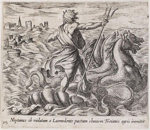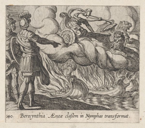Curator: This is Antonio Tempesta's "The Trojan Ships Changed into Nymphs," a small yet dynamic etching. It's held here at the Harvard Art Museums. Editor: It’s so dramatic! The lines are practically vibrating, like the whole scene is buzzing with frantic energy. Curator: The piece illustrates a scene from Virgil's Aeneid, exploring themes of transformation and divine intervention. The Trojan ships, through the intervention of Cybele, transform into sea nymphs to evade capture. It's a powerful symbol of resilience. Editor: I'm struck by the contrast between the stoic, almost bewildered soldiers on the left, and that wild chariot pulled by lions in the sky! It feels almost dreamlike. Curator: Tempesta's work often engaged with broader political and religious discourses of his time. This piece, in particular, reflects anxieties around maritime power and the ever-shifting allegiances in 16th-century Europe. Editor: It’s incredible how much story he manages to pack into such a small space. It's like a tiny, intense burst of mythology. Curator: Indeed. Looking at the piece through a postcolonial lens can reveal how such narratives were used to legitimize power. Editor: I love that. It really makes you think about how stories shape our world.