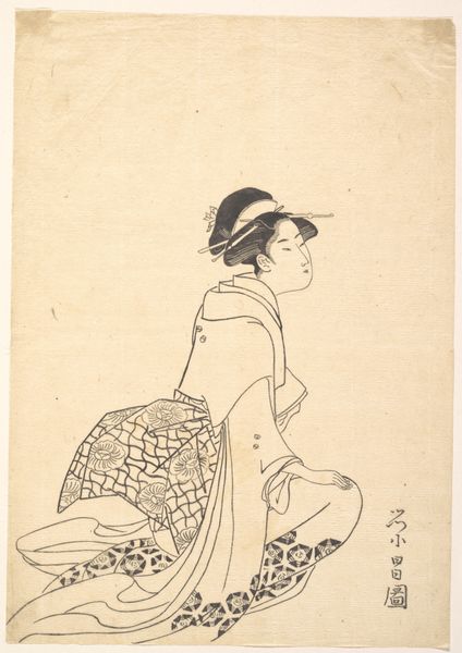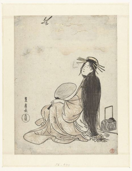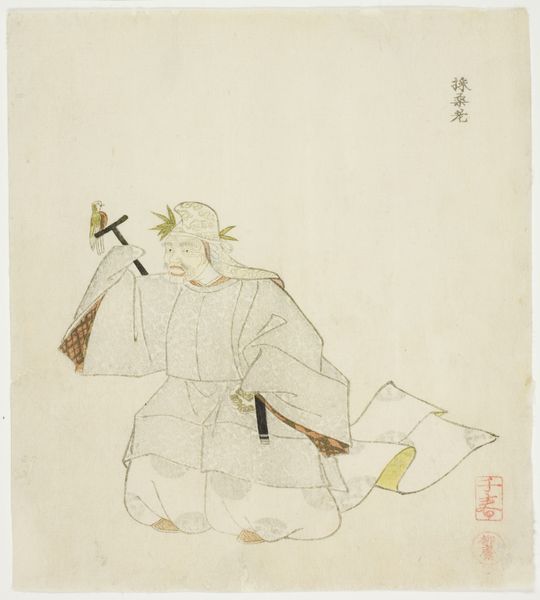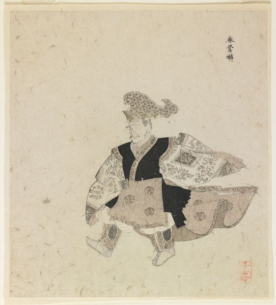 Curator: Look at the figure in this ink drawing, titled "Man met penseel in de hand"—that's "Man with Brush in Hand"—created sometime between 1700 and 1900 by the artist known as Ichirakasai. What catches your eye? Editor: It’s so raw and immediate. The texture of the ink itself makes the whole piece vibrate, you know? And that robe, with its quick, bold strokes—the whole image is a study in materiality. I want to touch it. Curator: Indeed. Note how the flowing lines create the garments, juxtaposed with the figure raising the brush, almost conducting an invisible orchestra. Is he perhaps invoking a muse? Is he inspired? What sort of spiritual journey might Ichirakasai want us to infer from that posture? Editor: Interesting! To me, the subject’s attire and brush signify not just creative potential, but very concretely, his class. He is able to afford those things, spend time on these gestures of supposed freedom… while perhaps exploiting other workers. This wasn't just some 'spiritual' journey, but a labor process involving specialized knowledge. Curator: Hmm, yes, but also a cultural performance; observe his confident profile—there’s a transmission of inner cultivation happening in this piece! The upraised brush, traditionally symbolizes creativity in East Asian art, implying self-discovery. Editor: Well, regardless of who's doing what... the relative monochrome suggests an attempt at cost-cutting—the paper isn’t even full! He used as little material as possible, likely reflecting the consumption contexts that governed the piece's reception back in the day. Curator: Perhaps. I see a self-assured mastery, rendering both subject and process into a form that conveys so much with the simplest of elements. It bridges not only artistry and symbolism but hints at the continuity of personal creativity within the East Asian artistic heritage. Editor: True, it leaves you wondering: how many hours, how much labor, how many discarded versions went into this *seemingly* simple performance of mastery! Still, the raw elegance certainly stays with you.