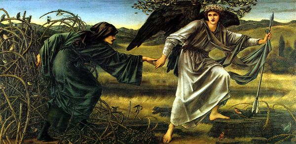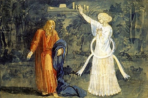 Editor: So, here we have "The Morning of the Resurrection" by Edward Burne-Jones, created around 1882 using tempera and oil paint. It's hard to ignore the texture created by those materials; it almost feels woven. How do you see this piece? Curator: What strikes me is Burne-Jones' deliberate choice to use tempera and oil paint together. This wasn’t just about aesthetics; it was a very conscious engagement with the methods and labor of earlier Renaissance painters he admired, before the dominance of purely oil-based techniques. He's challenging notions of progress in art, isn't he? Editor: That's fascinating! I was only thinking about the look of the paint itself, but what you’re saying makes me think about his process. Do you think this embracing of older methods would have resonated with viewers at the time? Curator: Absolutely. The Pre-Raphaelites were invested in craft as a form of resistance against industrialization, where the repetitive action diminishes the artist’s own involvement, or even agency. Consider the social implications of the availability of pre-mixed oil paints versus the painstaking process of creating tempera from raw materials, like egg yolk, for example. That directly involves him. Editor: So it’s as much about the artist's connection to the materials and their making as it is about the final image. Did that philosophy change his role as artist for his patron? Curator: Precisely. Burne-Jones sought a return to an artistic integrity tied to hand production and individualized artistic agency. Now, how do you interpret the expressions of those figures at the tomb? Editor: Thinking about production makes them seem less detached; I suppose there is a consciousness in their expressions. I definitely understand now how the materiality connects deeply to the meaning here. Curator: It enriches our understanding to move from the surface to its roots.