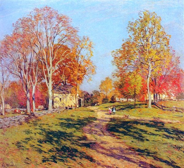 Theodor Philipsen likely painted this oil on canvas, Road through the Woods, Autumn, in Denmark, during the late 19th or early 20th century. Philipsen's landscapes often depicted rural life and nature, reflecting a growing interest in national identity and regionalism. He studied at the Royal Danish Academy of Fine Arts and was influenced by Impressionism and Post-Impressionism, which he encountered during his travels to France. The influence of these movements can be seen in his use of light and color, which captures the vibrant tones of the season. The depiction of a well-maintained road and managed woodland reflects the modernization and cultivation of the Danish countryside during this period. The logs in the foreground and cattle in the background signal a connection between nature and agrarian life. To fully understand Philipsen's work, we can consult archives from the Royal Danish Academy, exhibition reviews, and historical surveys of Danish art to better understand the cultural and institutional forces that shaped his artistic vision.