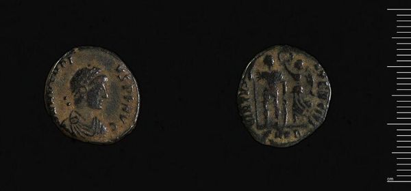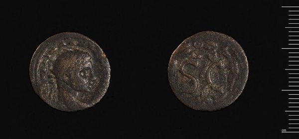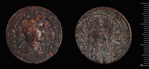 Curator: This is a coin minted in Kyme during the reign of Gallienus. Look at its materiality—bronze, worn smooth from use, telling its own silent story of exchange. Editor: I'm immediately struck by the figures depicted, they feel deeply rooted in Roman mythology and power dynamics of the time. Curator: Precisely! The die striking of this coin reveals a system prioritizing efficient reproduction. How does this mass production shape perceptions of power? Editor: It underscores the emperor's omnipresence. This coin acted as propaganda, circulating his image and solidifying his authority, but also hints at the complexities of labor and empire. Curator: The very act of imprinting becomes a form of material control. Editor: Exactly! This coin, small as it is, echoes larger narratives of Roman rule. I find it quite compelling. Curator: It's a fascinating object, dense with layers of meaning embedded in its very composition. Editor: Agreed, it certainly gives us a lot to think about.